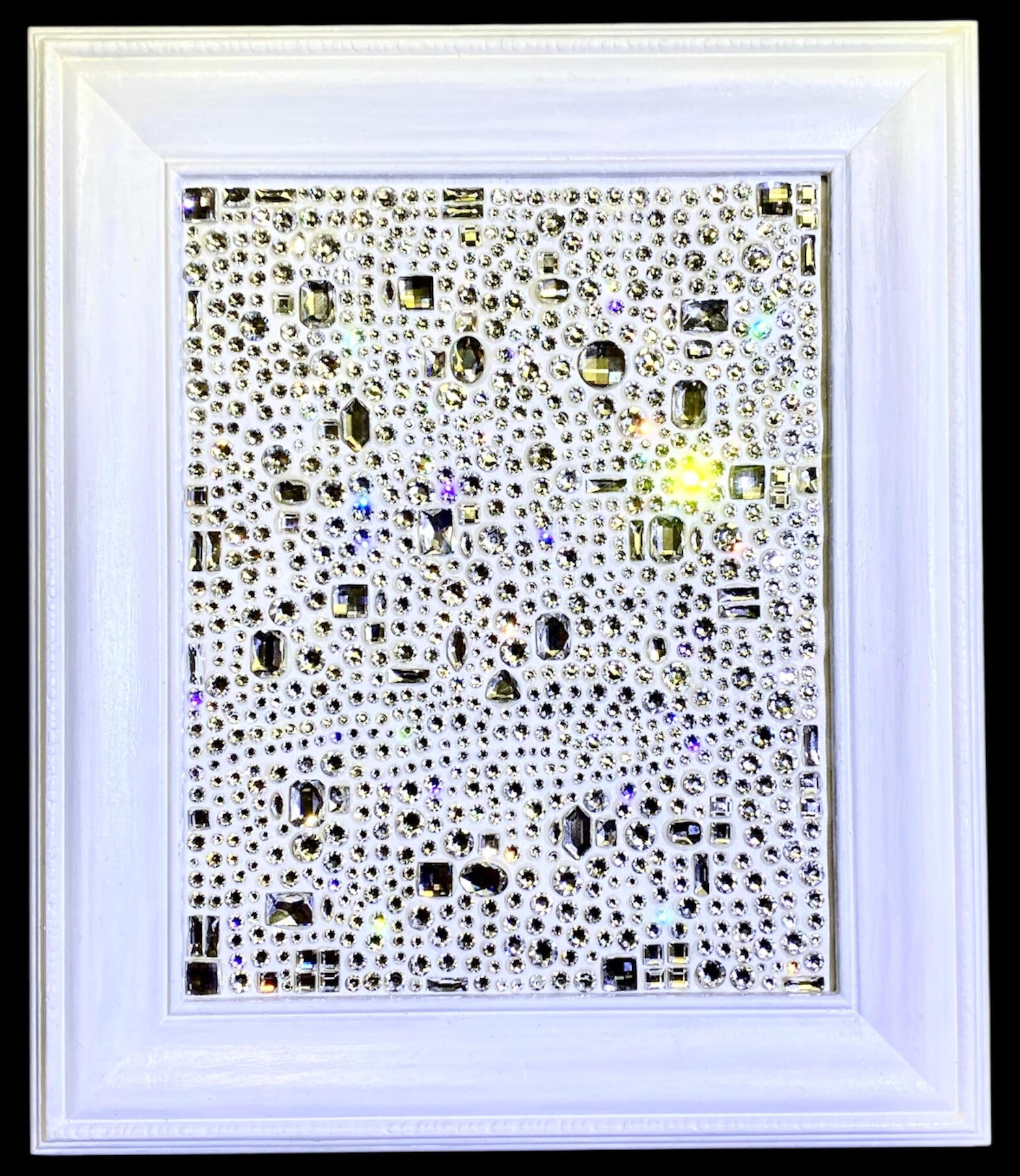 layers of paper, cardboard, fabric, glue, paint and acrylic stones